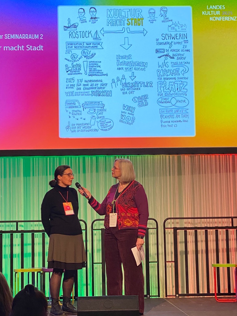 Die Ergebnisse der Workshops wurden in einer abschließenden Sitzung am Nachmittag über „Graphic Recording" resümiert: Engagiert für Kultur (Gutes Engagement braucht gute Rahmenbedingungen), Neue Wege auf dem Land (Kunst ist auch Mittel der Regionalentwicklung), Brücken bauen mit Kultur (Kulturelle Bildung ist mit politischer Bildung verzahnt), Kunst und Kultur stark machen (Vernetzung von Kunst und Kultur in Stadt und Land), Kultur macht Stadt (die „Platte" lebt) und Kultur mit Plan (am Beispiel Kulturkonzept Stralsund 2034). Weiterführende Informationen: Kultur-MV.de